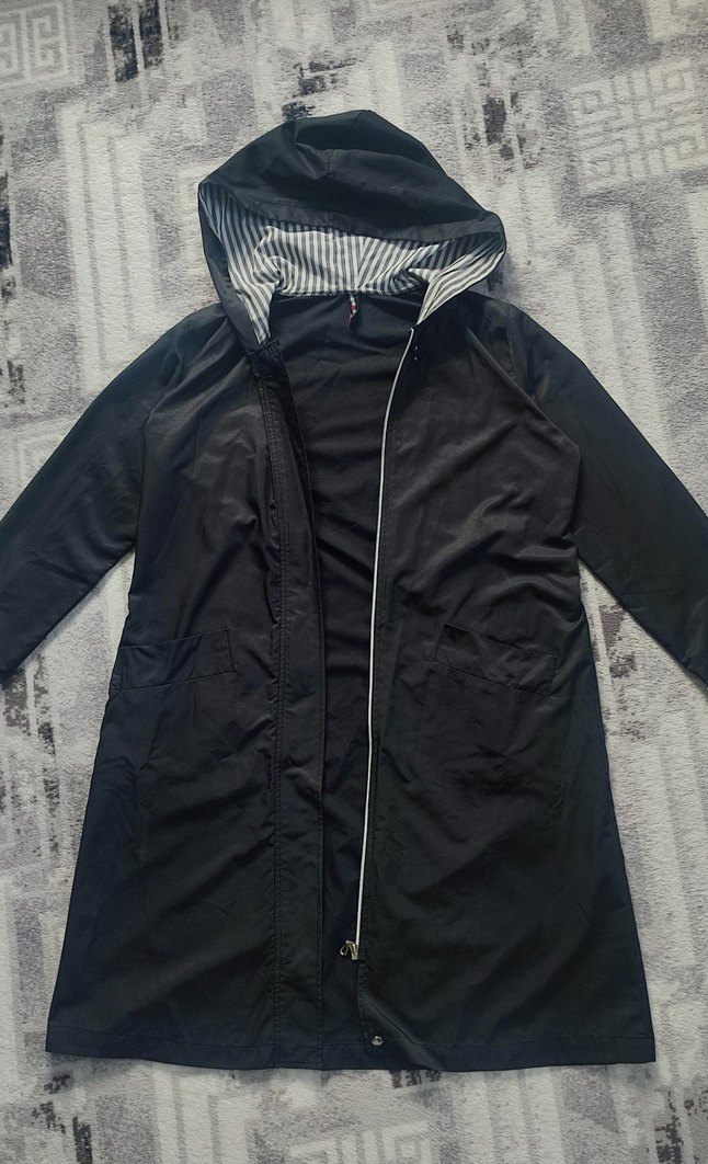 Kadın siyah uzun kapüşonlu yağmurluk, fermuarlı ön, uzun kollu ve kesimli yaka detayına sahiptir. Günlük rahat sokak stiline uygun, regular fit ve sentetik kumaştan üretilmiştir. ️