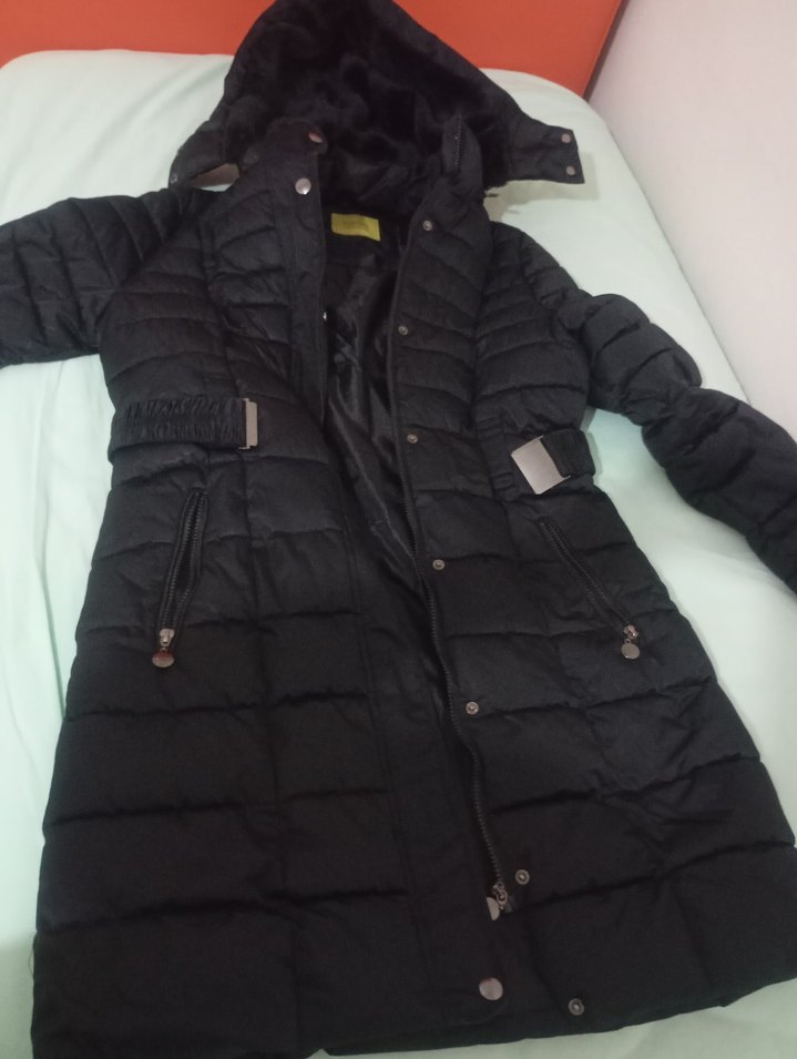 Kadınlar için uzun, siyah, fermuar ve çıtçıt kaplamalı kaban Yüzde yüz polyester kumaş Aşırı sıcak tutma garantili kapüşonu çıkarılabilir Hiç kullnilmadi sıfır gibidir Boynerden aldım