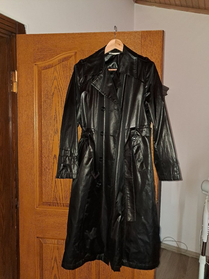 Fitted kesim, siyah uzun ceket, notched lapel yakalı ve kemerli, gotik stil, ofis için uygun.