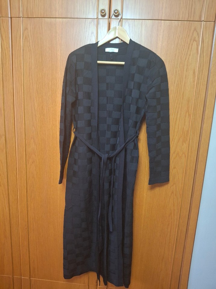Kadınlar için siyah, uzun ve kemerli hirka Düzenli kesim ve hafif kare desenli, uzun kollu, Paris normcore tarzında.