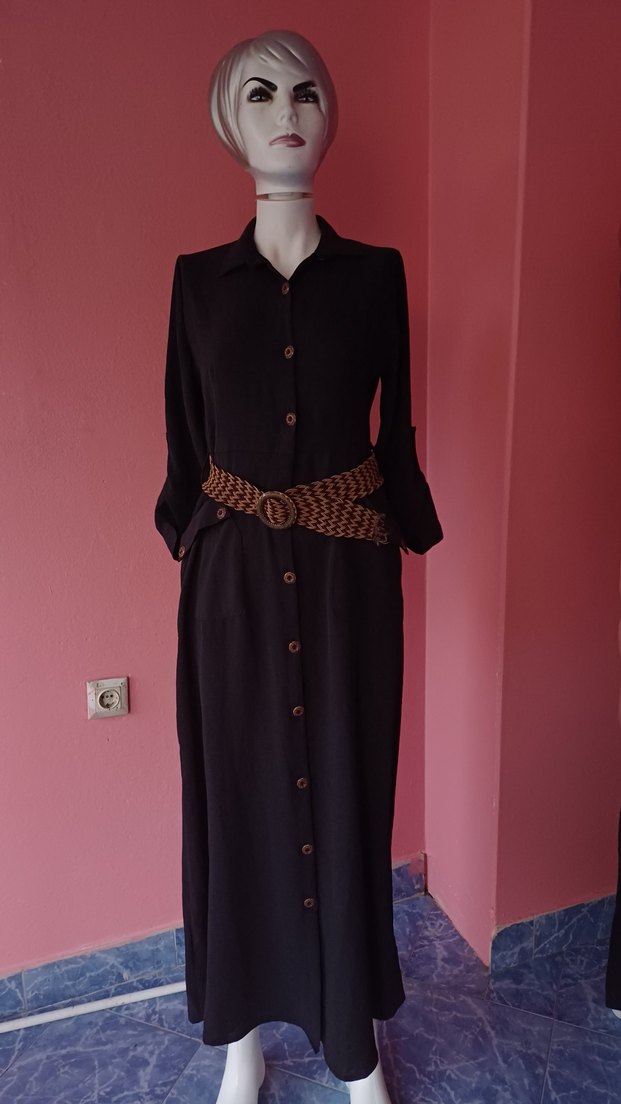 Siyah uzun elbise, kesik yaka, düğmeli ön ve klasik goth tarzı kemer ile. Uzun kollu, rahat kesim, günlük kullanım için uygun.