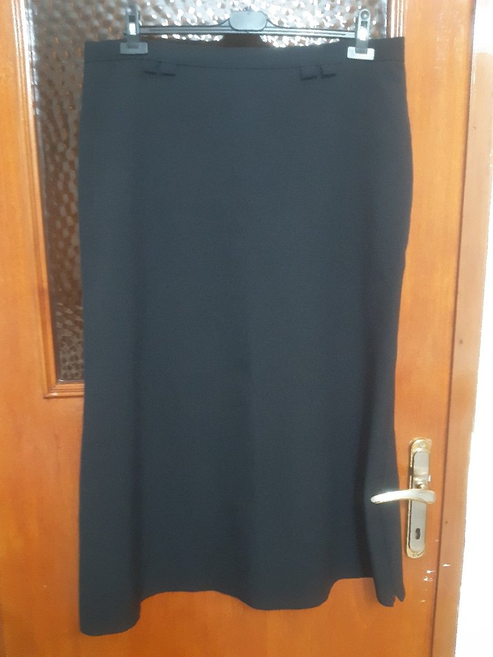 Kadınlar için siyah, kemerli, uzun boy, regular kesim etek. Ofis için uygun, sentetik kumaştan üretilmiştir.