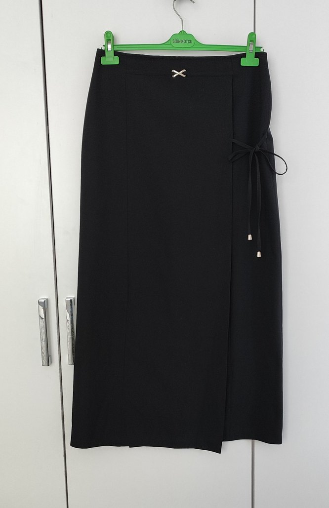 Siyah uzun etek, kemerli ve regular fit kesime sahip. Sentetik kumaştan üretilmiş, gotik tarzıyla ofis için şık ve modern bir seçenek.