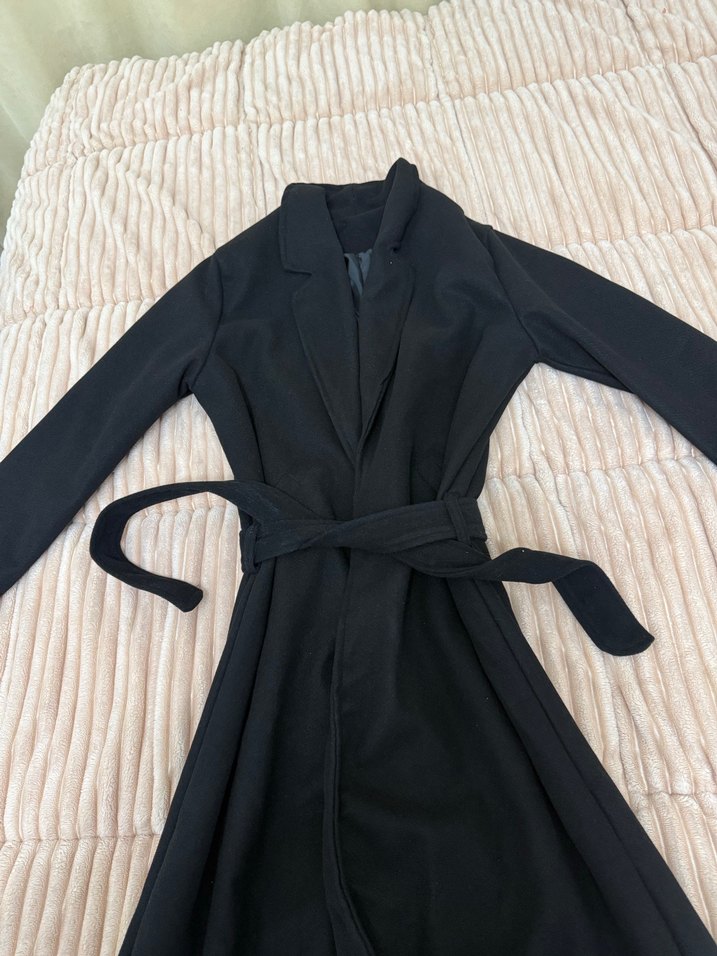 Siyah uzun kaban, kesik yaka ve kemer detayına sahip. Strappy kollu, klasik ve ofis stiline uygun, düz kesim ve sentetik kumaştan üretilmiştir.