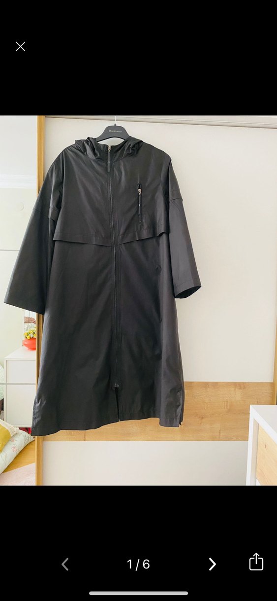 Kadın siyah uzun yağmurluk, bol kesim uzun kollu kapişonlu ve ön fermuarlıdır. Minimalist tarzda günlük kullanıma uygundur göğüs 54cm boy 110 cm