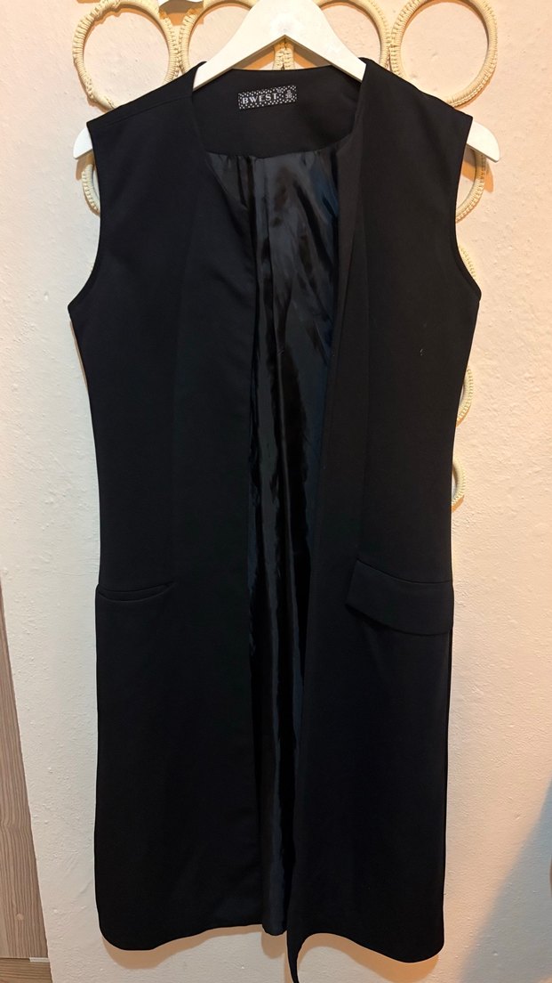 Kadınlar için uzun kesim, kolsuz, siyah sentetik kumaştan yapılmış yelek. Hem özel günlere hem ofis giyime uygundur. 36 bedendir. Ceplidir.