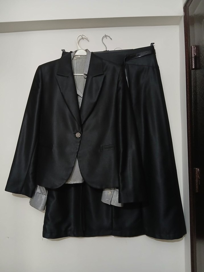 Kadınlar için siyah, saten dokulu, uzun kesim ve uzun kollu takım. Klasik zarif goth stilinde, ofis için uygun, yaka kısmı kesik ve drapeli. yırtmaçlı tül detaylı etek