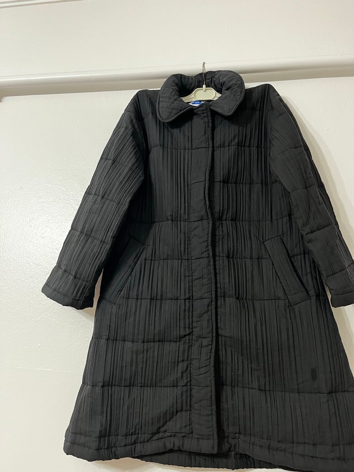 Kadınlar için keten kumaştan, pileli ve notched lapel yakalı siyah uzun ceket. Regular kesim, sokak stili ve günlük kullanıma uygun. Strappy kollara sahip, desen yok.