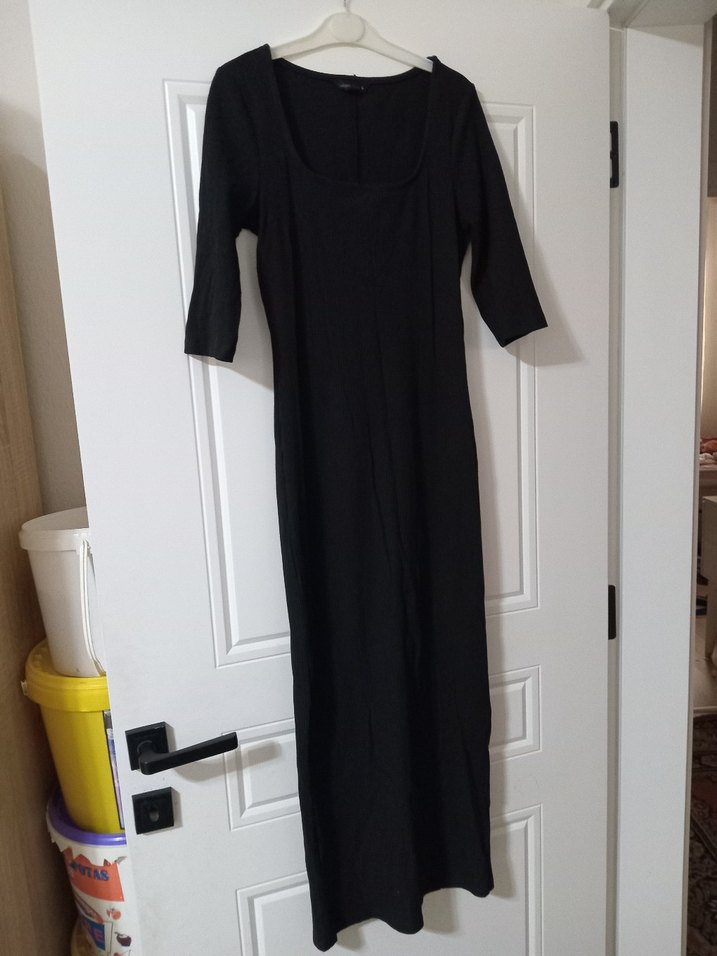 Keten kumaştan, uzun kollu ve drapeli, tek renk siyah uzun, vücuda oturan kadın elbisesi. Ofis için uygundur.