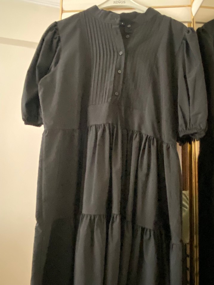 Siyah keten uzun elbise, yüksek yakalı, kısa kollu ve fırfırlı detaylara sahip. Bol kesim ve bohem tarzda, günlük kullanım için uygun.