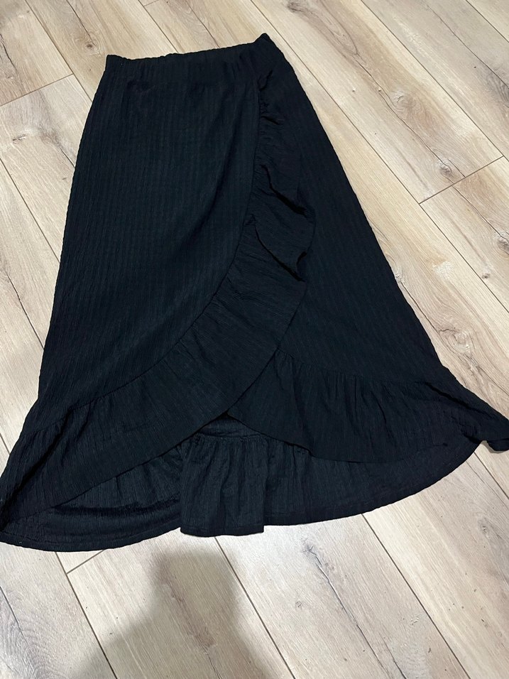 Siyah uzun keten etek, bol kesim ve volan detaylara sahiptir. Bohem ve retro tarzlara uygun, günlük kullanıma idealdir.