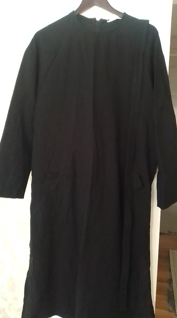 Kadınlar için uzun boy, oversize kesim ve drapeli tasarıma sahip keten kaban. Siyah, minimal tarzda, ofis kullanımı için uygundur.