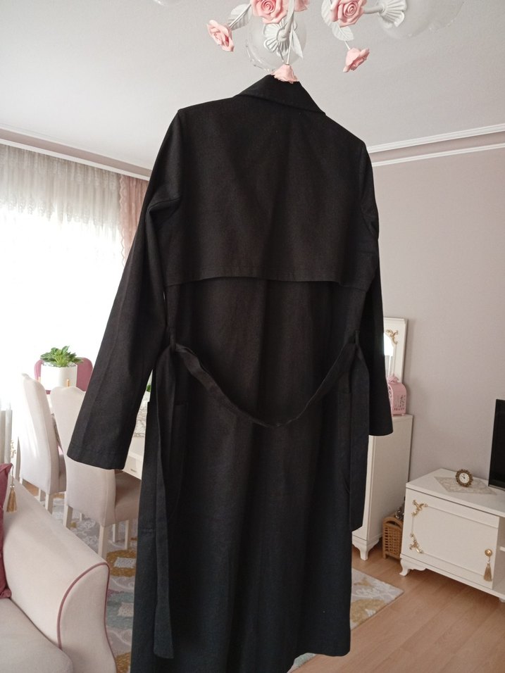 Siyah keten trençkot, uzun kollu, yakası kırmalı ve drapeli tasarıma sahiptir. Düzenli kesimi ve gotik Paris tarzıyla günlük kullanıma uygundur.