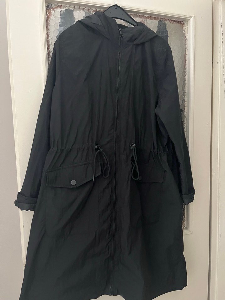 Siyah uzun keten yağmurluk, bol kesim ve drapeli tarzıyla notched yaka detaya sahiptir. Minimalist ve günlük kullanıma uygundur. ️