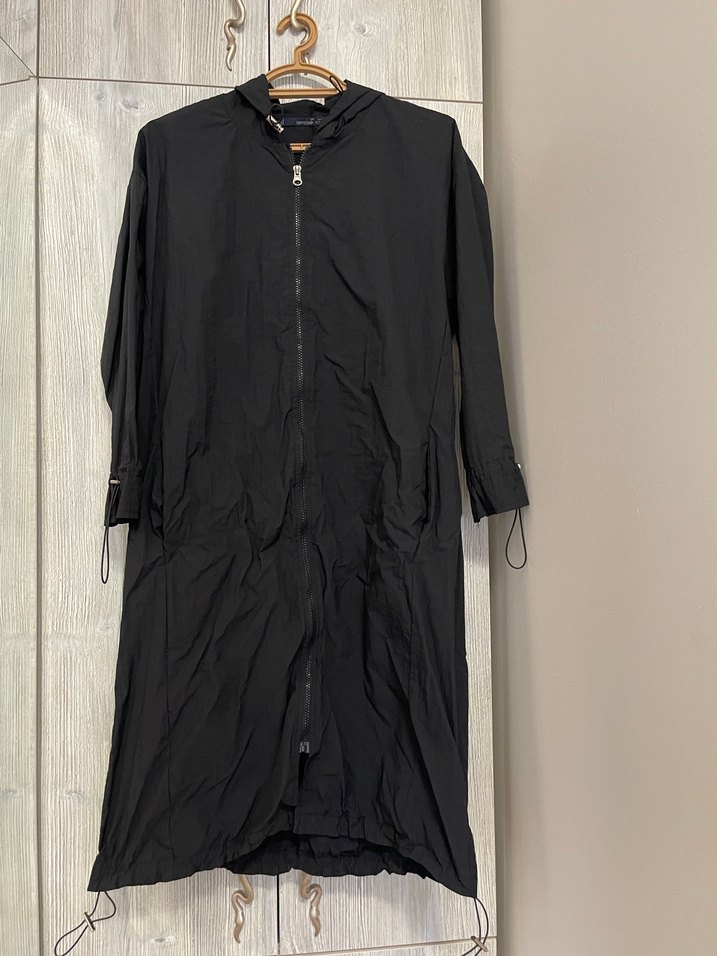 Siyah uzun keten yağmurluk, bol kesim ve drapeli detaylarla, yakası kesik yaka tasarımına sahiptir. ️