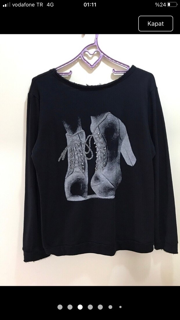 Siyah renkli, uzun kollu ve baskılı tasarıma sahip swit kazak. Salaş kesim ve yuvarlak yaka ile gündelik kullanıma uygun.