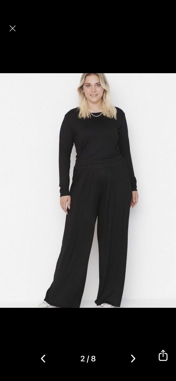 Kadın siyah takım uzun kollu ve bisiklet yakalıdır. Yumuşak keten kumaştan, bol kesim ve uzun boyda, günlük kullanım için rahat ve şık bir tercihtir.