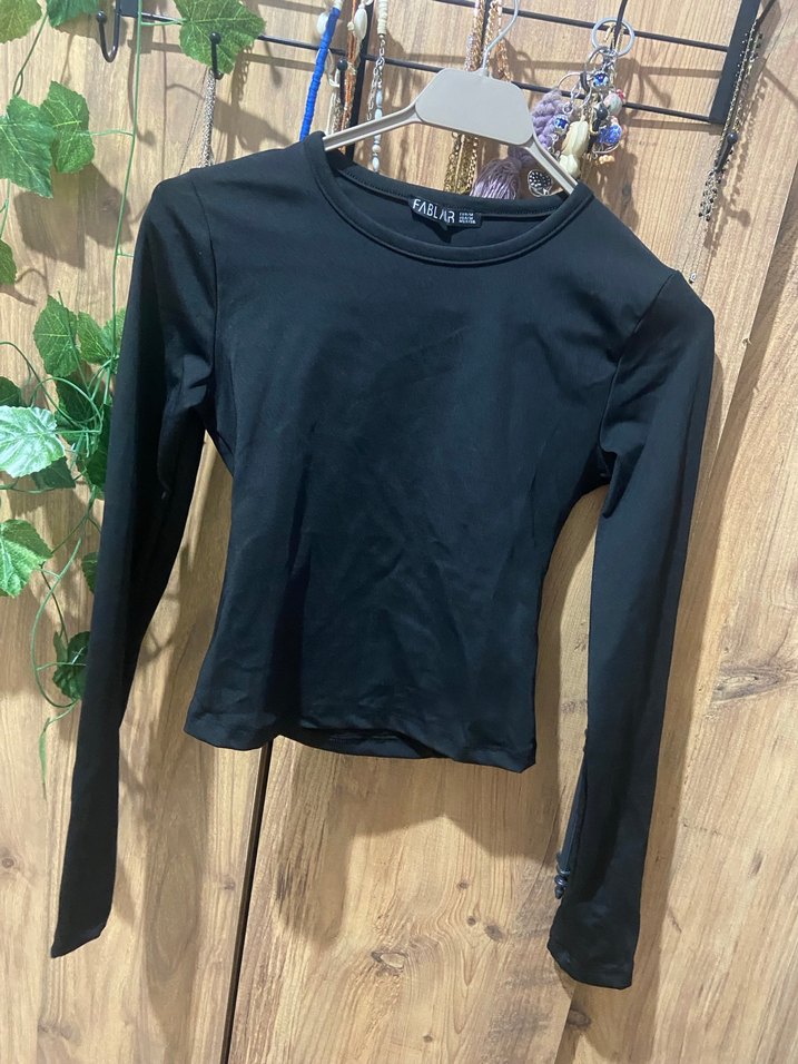 Siyah, uzun kollu, ince kesimli crop top. Yuvarlak yakalı ve düz desensiz, rahat sentetik kumaştan yapılmıştır.