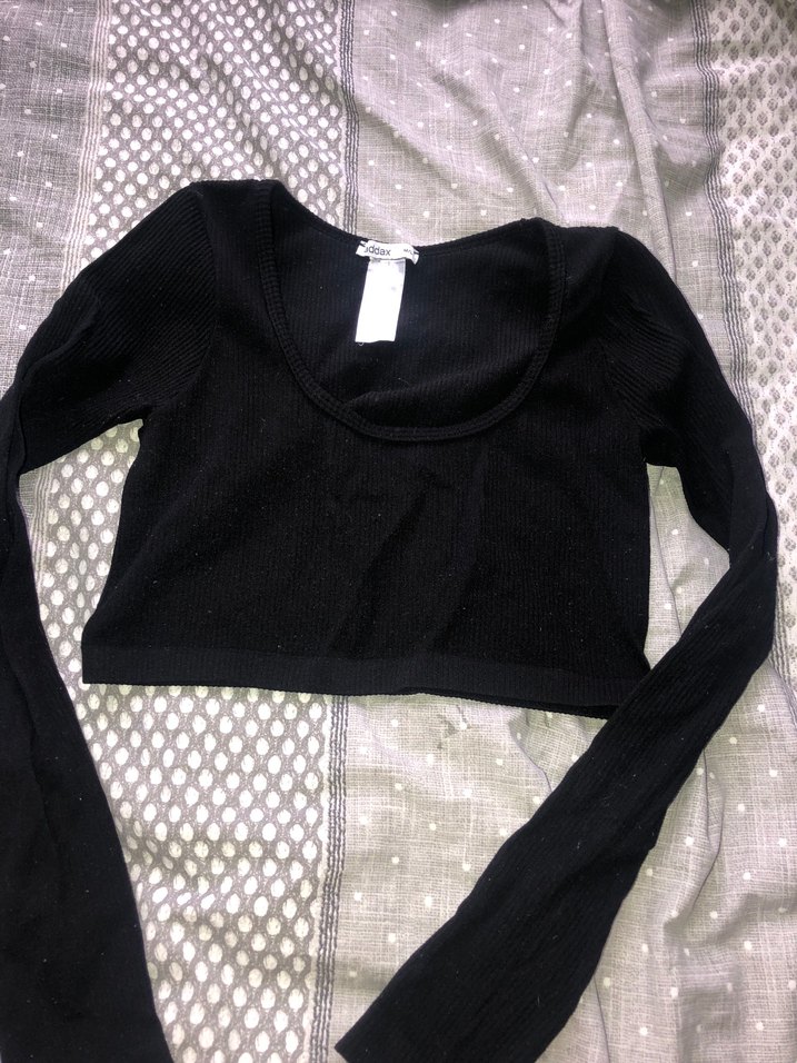 Siyah renkli, uzun kollu ve yuvarlak yakalı bu crop top, sentetik örgü kumaştan üretilmiştir. Minimalist ve sokak tarzı için uygundur.
