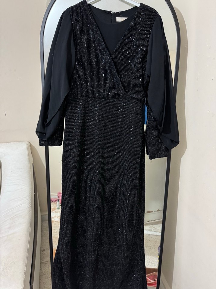 Kadın Siyah Uzun Kollu Drapeli Abiye Elbise