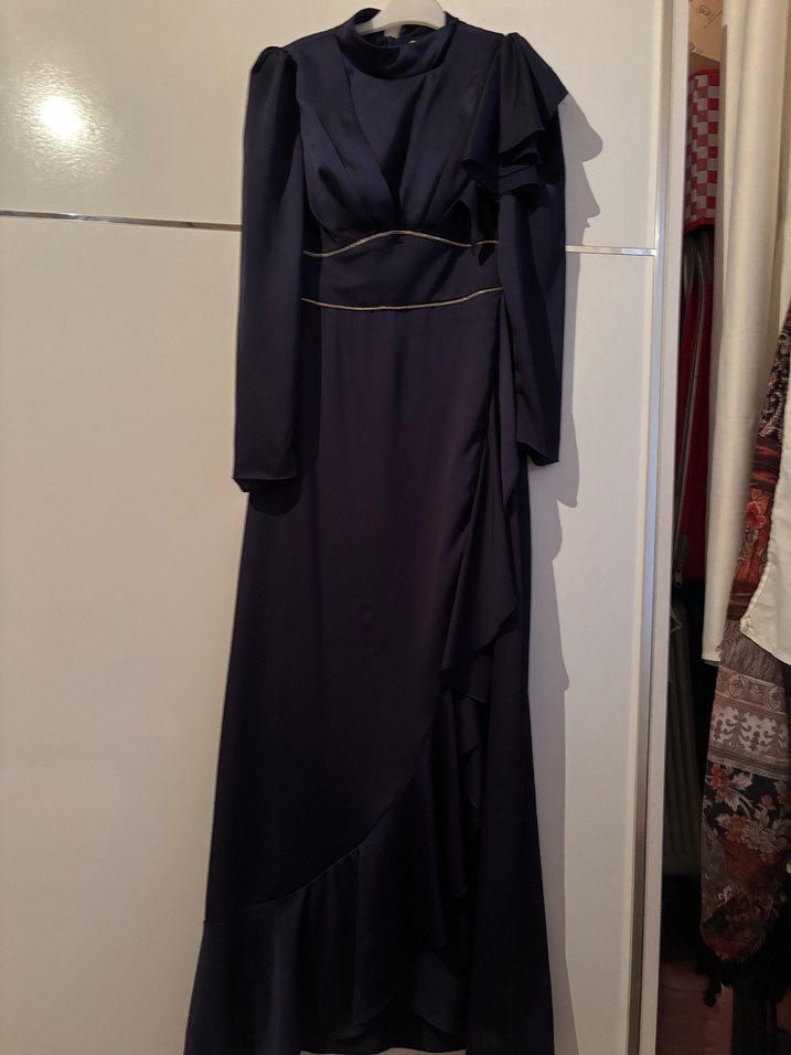 Kadınlar için uzun lacivert gece elbisesi, uzun kollu ve yüksek yakalıdır. Drapeli tasarımı ve modern klasik, gotik tarzıyla düğün söz için uygundur.