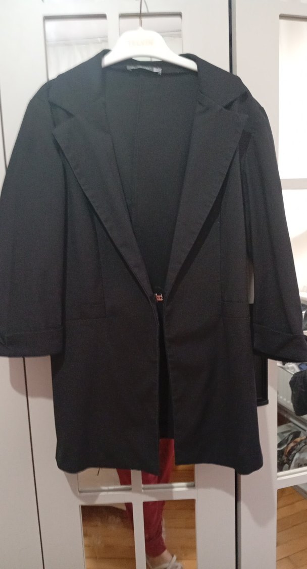 Kadınlar için siyah, uzun kollu, düğmeli ve kesimli yakalı uzun blazer. Ofis ve gündelik şıklık için uygun, ipeksi dokulu kumaştan yapılmıştır.