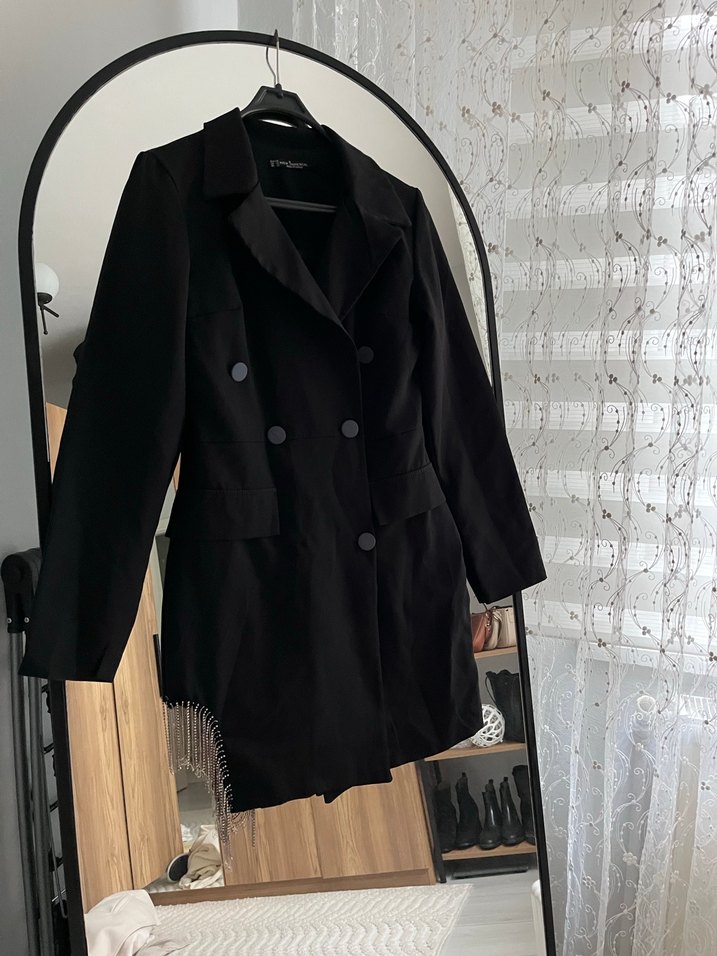 Kadın siyah blazer, uzun kollu ve düğmeli, düz renk, regular fit, notched lapel yaka ile ofis ve günlük kullanıma uygun. Kemerle kullanılabilir 42 beden yazıyor ama öyle asırı büyük değil elbise gibi duruyor zaten