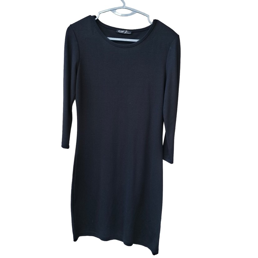 Kadın siyah, bisiklet yaka uzun kollu elbise, vücuda oturur dar kalıptır. omuzunda bulunan kürk parçalar çıkarıldığı için dikiş izleri mevcuttur (3.görselde görebilirsiniz) onun haricinde hiçbir sorunu yoktur. dar olduğundan satıştadır.