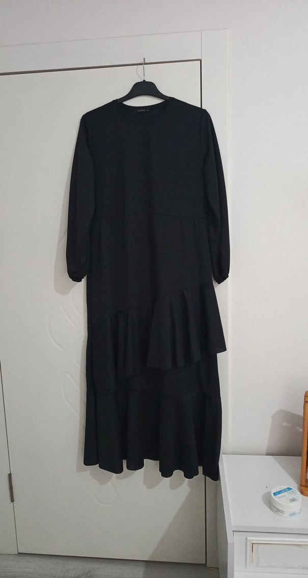 Bu siyah uzun elbise, uzun kollu ve yuvarlak yakalıdır. Fırfır detayları ve bol kesimiyle minimalist gotik tarzda, yumuşak sentetik kumaştandır. Günlük kullanıma uygundur.