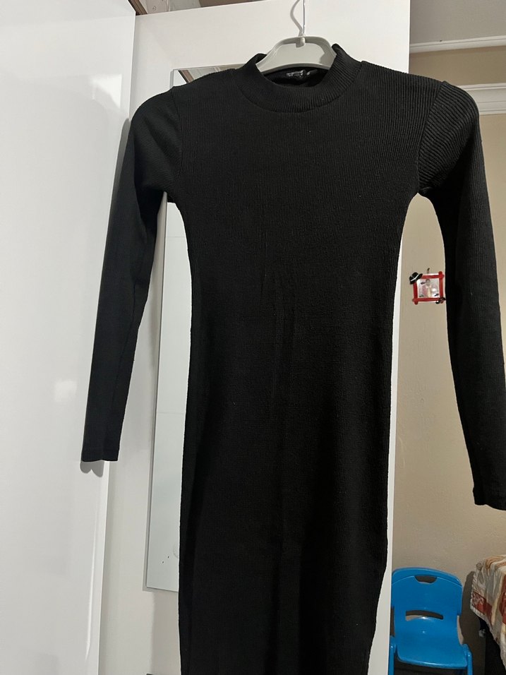 Kadınlara özel, uzun kollu ve yüksek yakalı, triko dokulu siyah uzun elbise. Minimalist ve avangart sokak stili için uygundur.