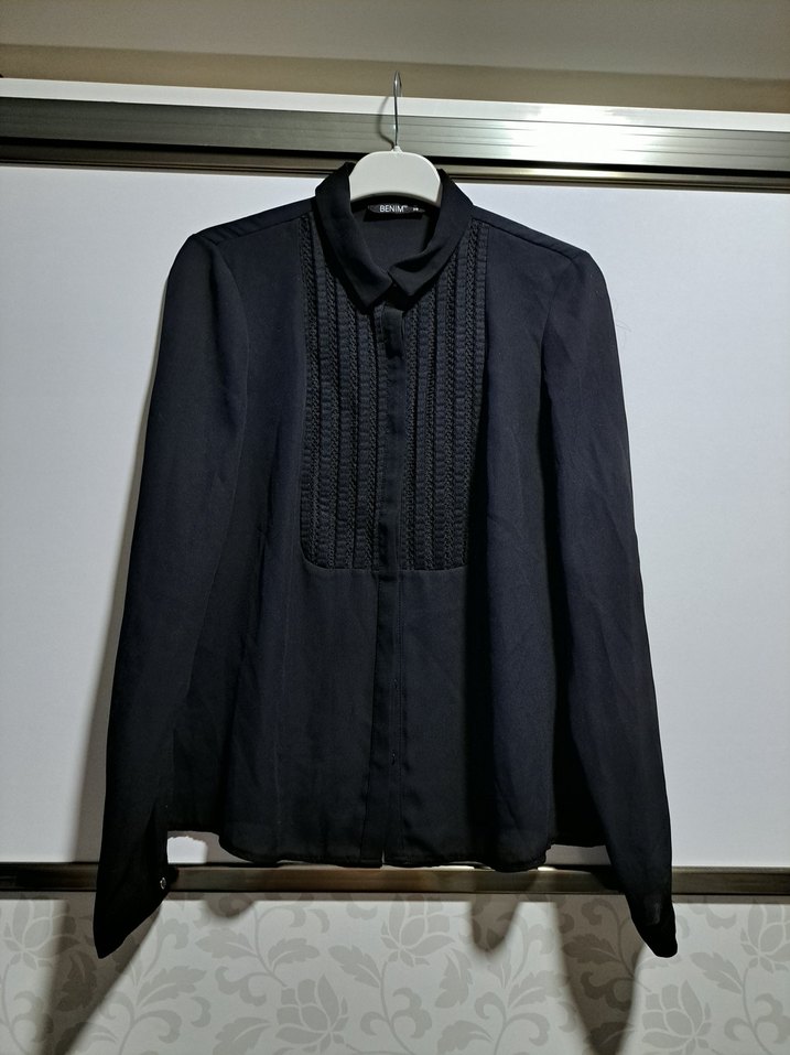 Siyah uzun kollu kadın gömleği, yakalı ve düğmeli ön detaylı. ince kumaşlı 38 beden sorunsuz