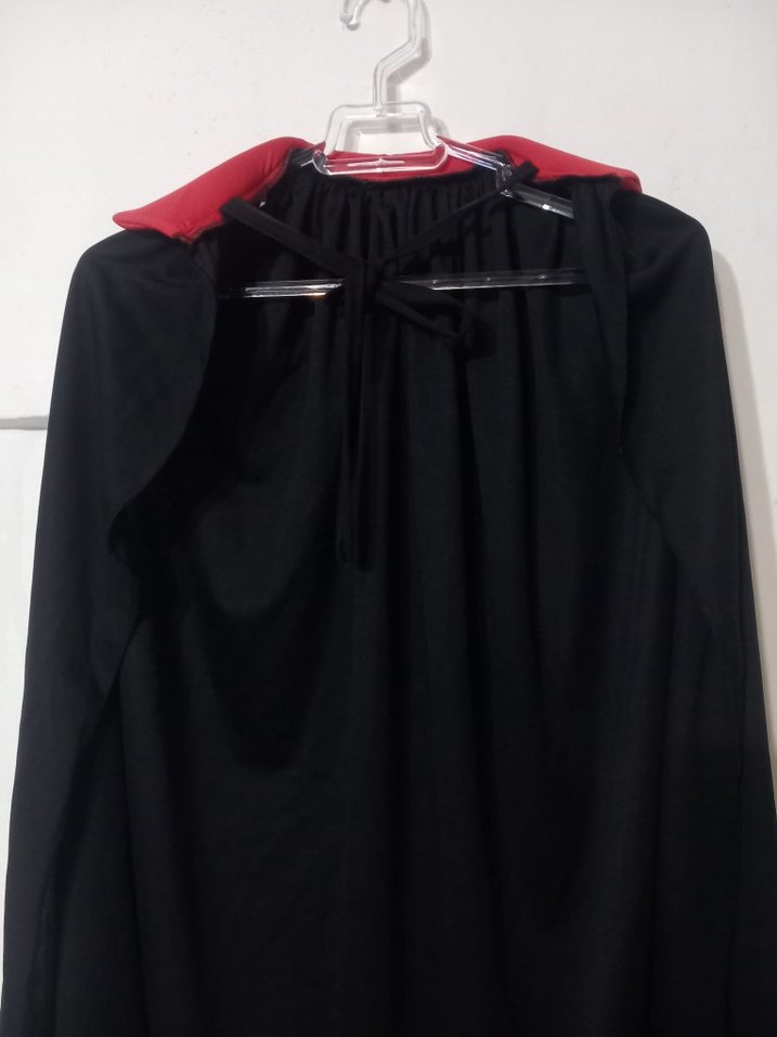 Kadınlar için uzun kollu, bol kesim ve siyah renkte gotik tarzda uzun elbise. Kırmızı kapüşon detayı ve desen içermeyen kumaşı ile karanlık bir görünüm sunar.