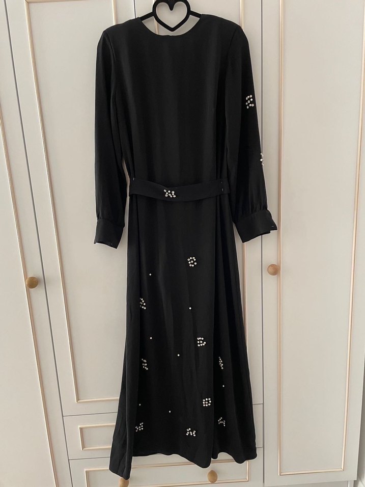 Siyah, uzun kollu, yuvarlak yakalı, bol kesim elbise. İpek gibi kumaş, İnci detaylar ve kemerli tasarım ile şık bir görünüm sunar.