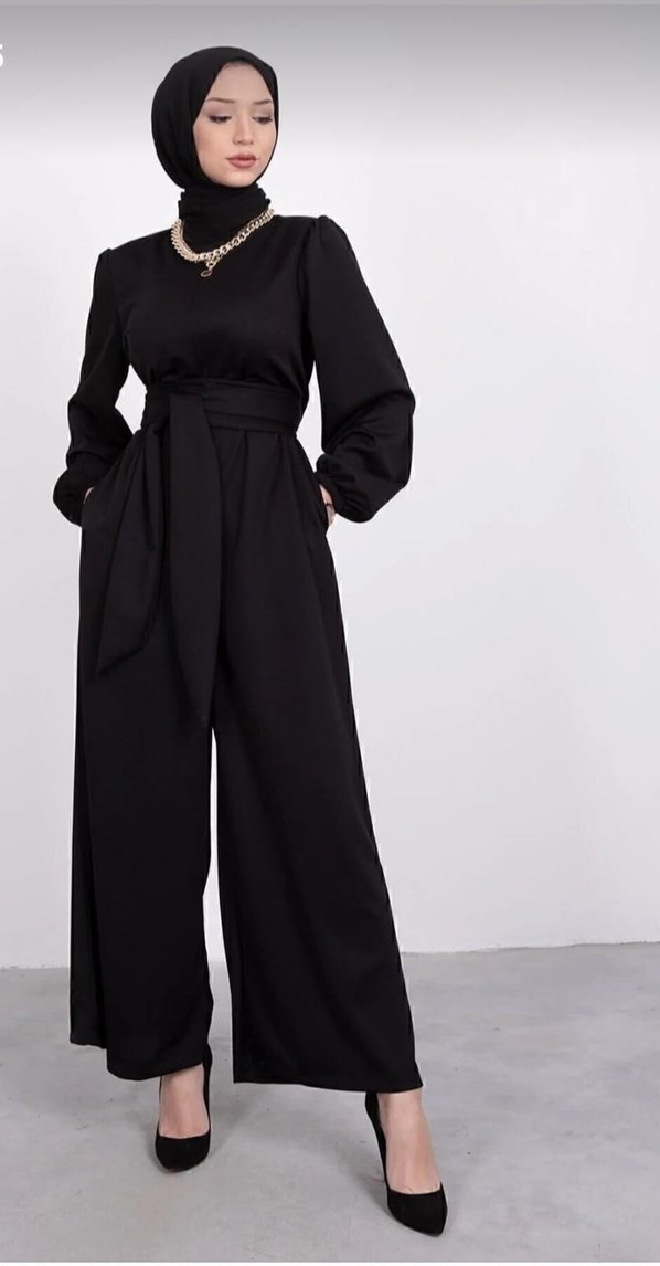 Siyah, yüksek yakalı, kemerli uzun tulum. Uzun ve bol kollu, ipeksi kumaştan, sade ve modest tarzda.