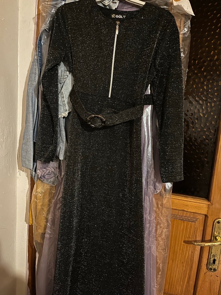 Dar kesim siyah uzun elbise, uzun kollu ve yüksek yakalıdır. Aynı kumaştan kemeri vardır, yumuşak sentetik kumaştan üretilmiştir.
