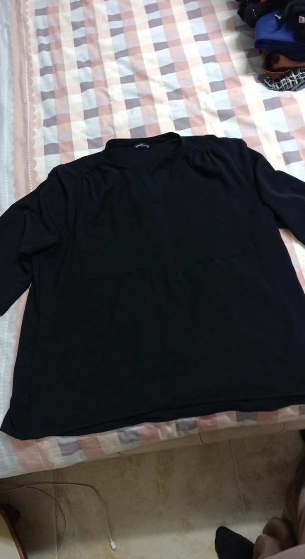 Siyah keten kumaştan, uzun kollu, yuvarlak yaka, bol kesim ve normal boyda kadın tişörtü. Rahat ve günlük kullanıma uygun.