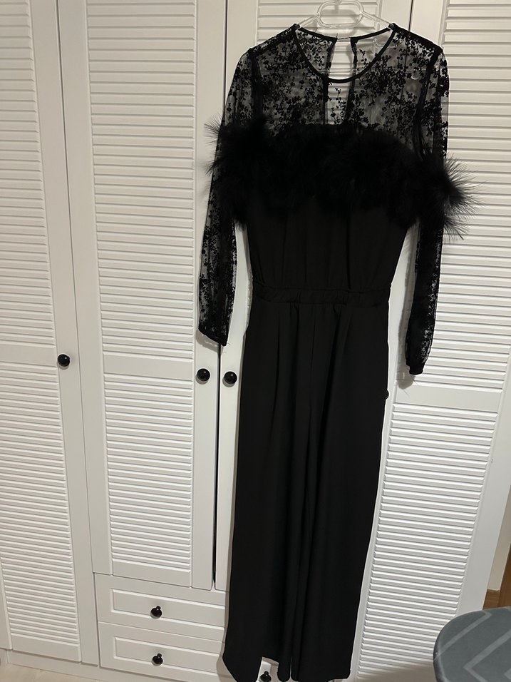 Siyah uzun kollu, kürklü detaylı uzun tulum. Sentetik kumaştan, straplez yaka ve dantel üst kısmıyla gotik tarzda, vücuda oturan kesim.