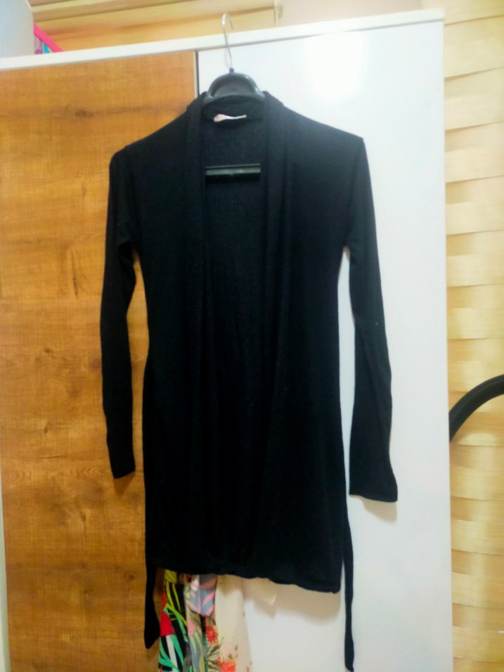 Siyah, uzun kollu, kuşaklı ve yüksek yakalı kadın hırka. Düz ve uzun kesimiyle günlük rahat kullanıma uygundur. Sentetik yumuşak kumaştan üretilmiştir.