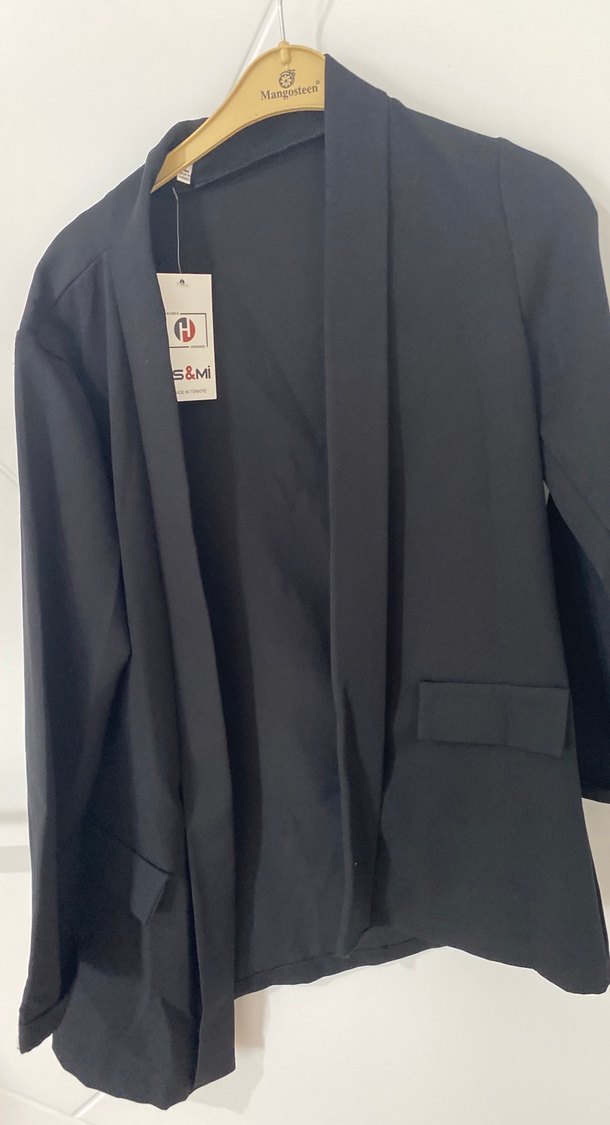 Kadın siyah blazer, kesik yaka ve uzun kollu. Normal boyda, rahat kesim ve ipeksi kumaştan. Ofis ve sokak stiline uygun, desensiz ve koyu renkte.