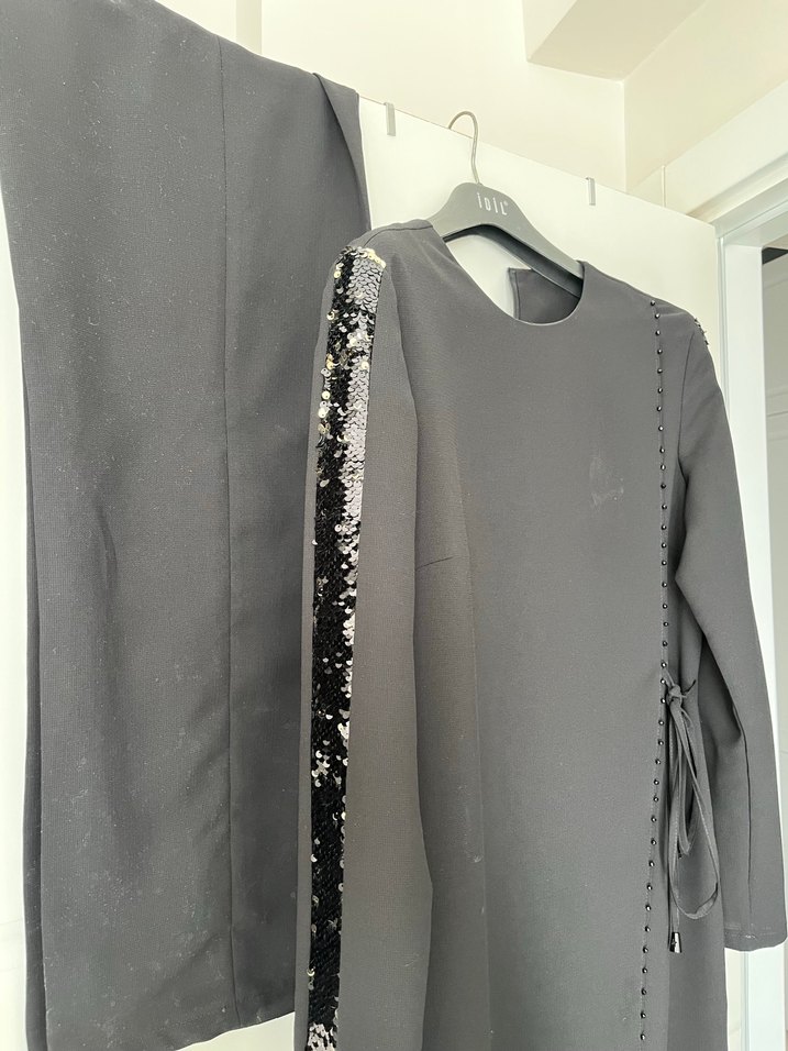Kadınlar için sentetik kumaştan yapılmış, siyah renkte, uzun kollu ve payet detaylı minimalist, avangart ofis takımıdır. Pantolon tunik şeklindedir