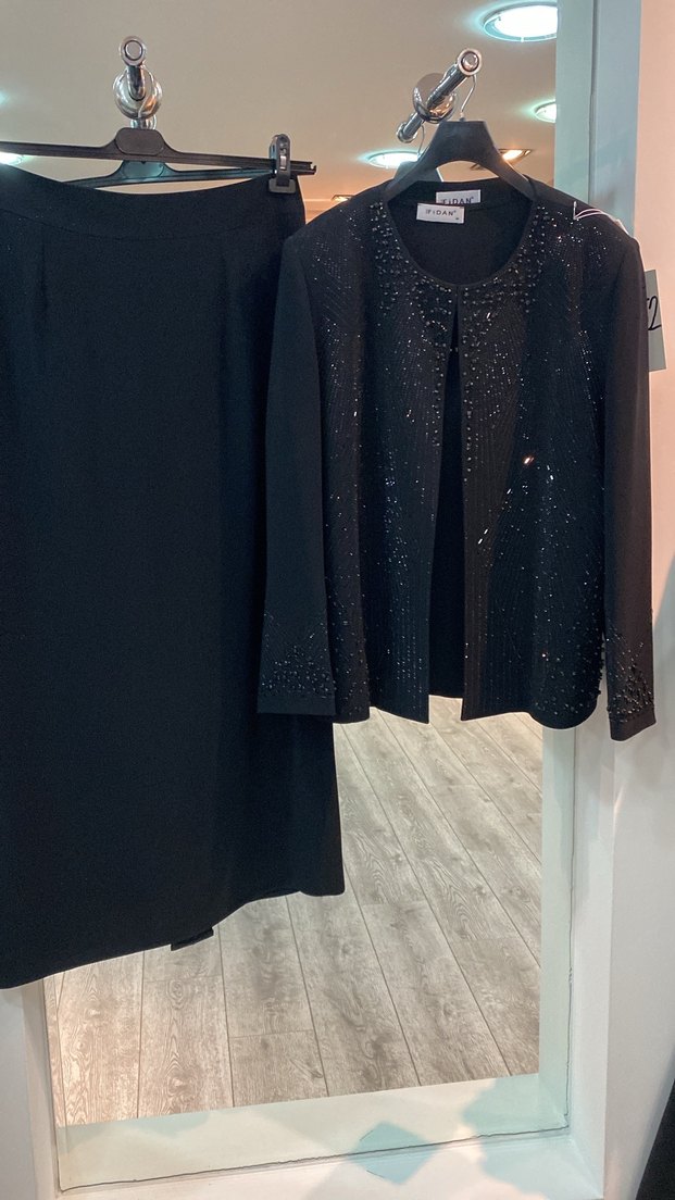 Siyah, uzun kollu kadın takımı, ipeksi dokunuşlu ve payet detaylıdır. Çentikli yaka ve regular fit ile ofis için uygundur. ✨Firma ürünü etiketli 44/46 bedene uyumlu