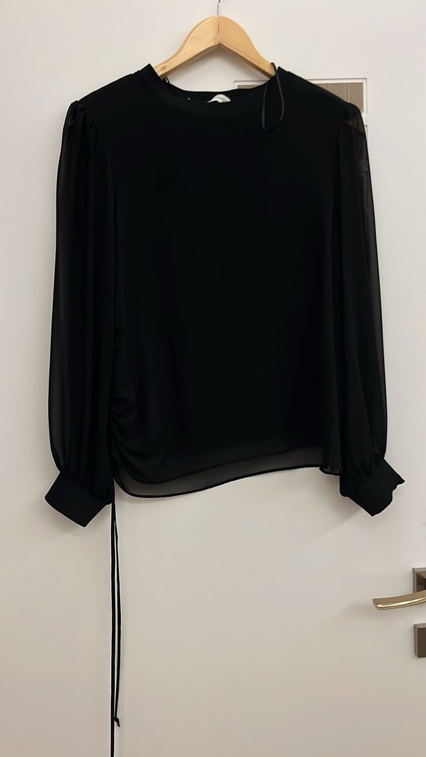 Siyah, uzun kollu, yuvarlak yakalı ve salaş kesimli, ipeksi dokulu drapeli kadın bluz. Minimalist gotik tarzıyla ofis ve günlük kullanıma uygundur.
