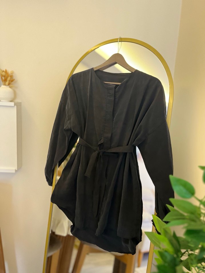 Kadınlar için tasarlanmış, salaş kesim, uzun kollu ve uzun boyda siyah renkte sade bir ceket. Minimalist, belden bağlamalıdır. 36 40 beden uyumludur tensel Kupra kumaştan üretilmiştir