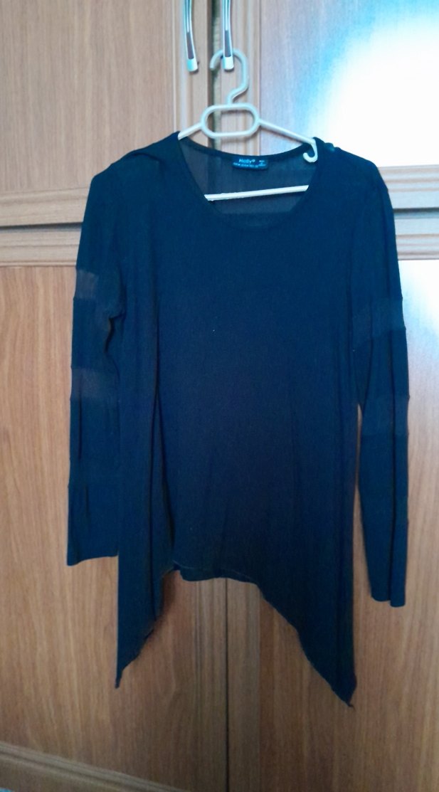 Siyah, uzun kollu, yuvarlak yakalı, bol kesim bluz. Rahat ve minimalist tarzda, günlük kullanım için yumuşak kumaş.