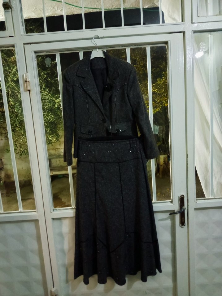 Siyah renkte, uzun kollu ve yakalı, dökümlü kadın takım elbisesi. Sentetik kumaştan, tarzda ve ofis için uygun.Sadece 1 kez kullanıldı❤️