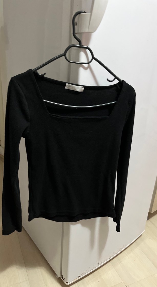 Uzun kollu, tekdüze siyah bluz, kayık yaka ve vücuda oturan kesime sahip. Pürüzsüz sentetik kumaştan, günlük kullanıma uygun goth tarzı.