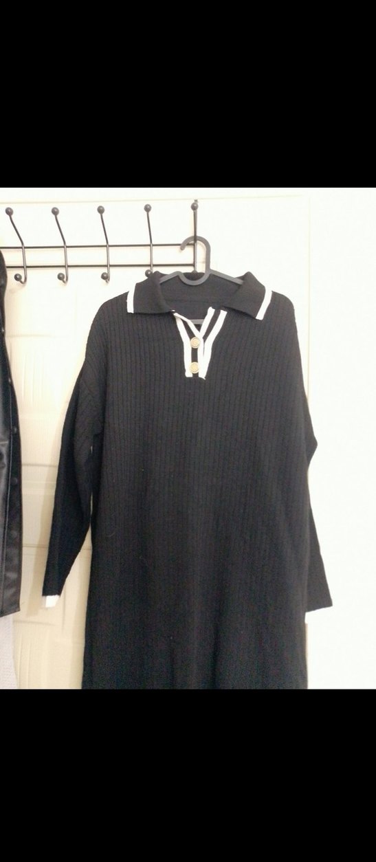 Kadın siyah uzun kollu triko elbise, düğmeli yakası ve rahat kesimi ile günlük sokak stiline uygun örme kumaştan yapılmıştır.