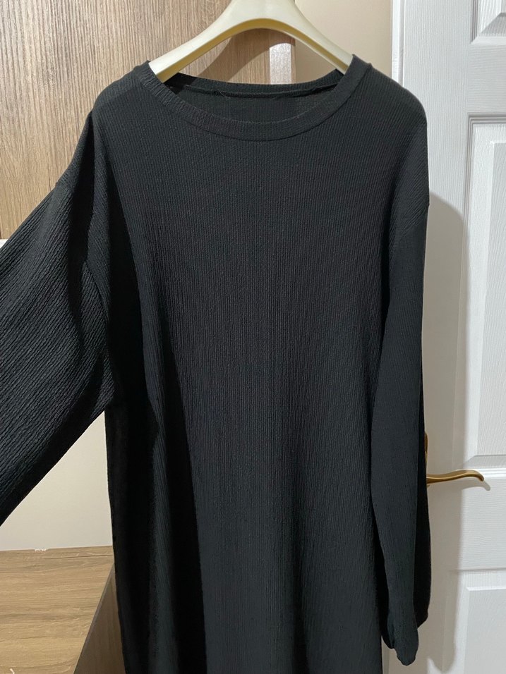 Kadınlar için siyah, uzun kollu triko elbise. Yuvarlak yakalı, bol kesim, polyester rahat ve sade bir gündelik stil sunar.