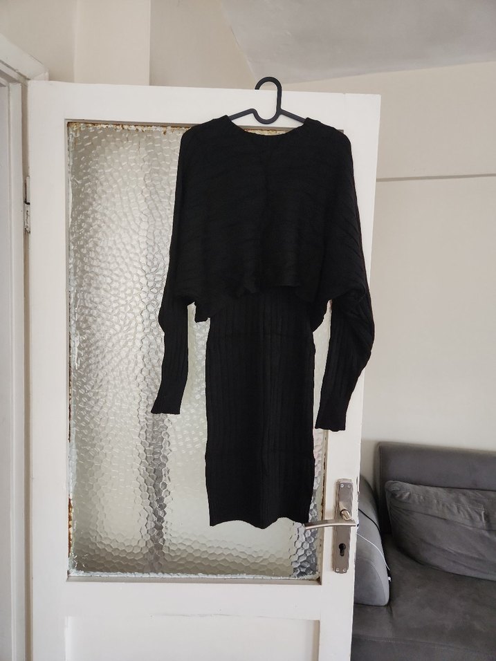 Dar kesim siyah triko elbise, uzun kollu ve bisiklet yaka detaylıdır. Pilili tasarımıyla gotik tarzı yansıtır.