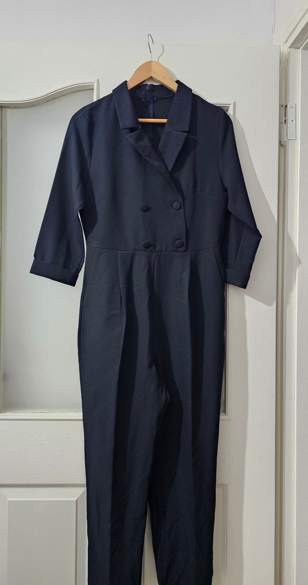 İADE YOKTUR! Kadın, siyah renk 3/4 kollu uzun tulum. Boyunuz uzunsa paçaları biraz kısa gelebilir M bedene olur. Çok şık nişan, düğün ya da iş hayatına uygundur. Kumaşı ve kesimi çok kaliteli duruyor. Ben bir kere giydim, kusuru yoktur.